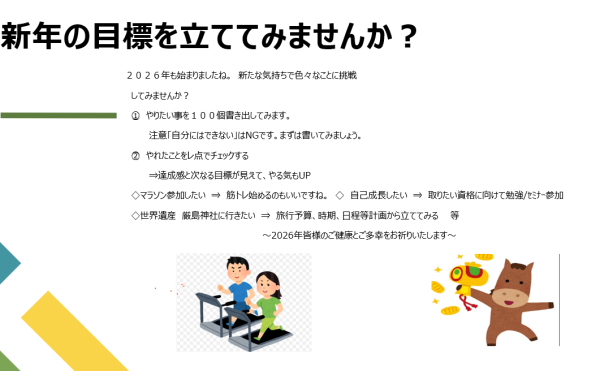 2026年1月6日さくら保険事務所 新年の目標を立ててみませんか? 新たな年の目標として、健康維持(運動、食生活)、自己成長(スキルアップ、読書)、経済安定(貯蓄、節約)、 趣味の充実(新しいことへの挑戦、再開、継続)などが人気のようです、具体的に数字を入れたり、1日10分から […]
